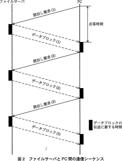 ファイルサーバとPCとの間でファイル転送を行う際には,図2に示すように,PCからファイルサーバに対して読出し要求を行う。ファイルサーバは,ファイルを固定サイズのブロック(以下,データブロックという)に区切つて,PCへ送信することを繰り返す。2回目以降は,PCからの読出し要求に確認応答が含まれており,ファイルサーバは,PCから確認応答が届くまで次のデータブロックを送信することができない。PCが読出し要求をファイルサーバへ送出し始めてから,ファイルサーバの送信したデータブロックが届き始めるまでを応答時間と呼ぶ。この応答時間は,札幌又は広島営業所と東京本社との間が45ミリ秒,大阪営業所と東京本社との間が24ミリ秒であった。ここで,通信障害による再送はないものとする。