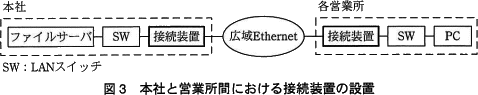 図3に示すように,ファイル転送の高速化のために,広域Ethernetへの接続装置の導入を検討することになった。接続装置は,本社と各営業所にそれぞれ設置され,広域Ethernetを挟んで対向して使用される。