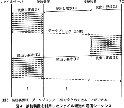 この接続装置は,PCに代わって読出し要求をファイルサーバへ送ることができ,ファイルサーバは連続してデータブロックを送信できるようになる。この接続装置を利用した場合のファイル転送の通信シーケンスを図4に示す。