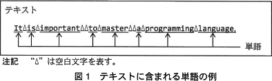 - 単語は,空白文字及び改行文字を含まない文字列であり,空白文字又は改行文字で区切られている。単語の文字数は 20 以下とする。図1に,テキストに含まれる単語の例を示す。