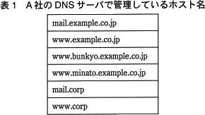 A社のDNSサーバで管理しているホスト名を,表1に示す。