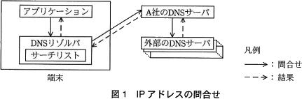 ホスト名に対応するIPアドレスを知りたいアプリケーションは,DNSリゾルバ(各端末で動作し,DNSサーバにIPアドレスの問合せを行うプログラム)に,ホスト名に対応するIPアドレスを問い合わせる。問合せを受けたDNSリゾルバは,A社のDNSサーバに問い合わせる。