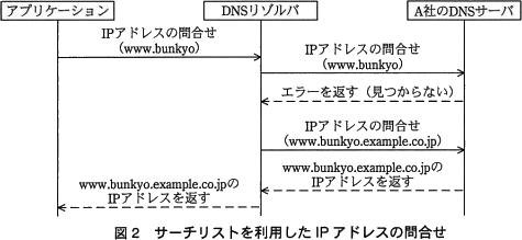 例えば,ホスト名"www.bunkyo.example.co.jp"のIPアドレスを知りたいときは,ホスト名"www.bunkyo"で問い合わせれば,ホスト名"www.bunkyo.example.co.jp" のIPアドレスが,次のようにして得られる(図2)。ここで,"bunkyo"というTLDは存在しないものとする。