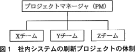 B社で立ち上げた社内システムの刷新プロジェクトでは,関係者間における情報の配布を考慮したコミュニケーションの計画を立案することにした。関係者とは,B社の情報システム部及びベンダL社である。このプロジェクトは,作業を効率よく進めることを目的に,プロジェクトマネージャ(以下,PMという)を頂点とするプロジェクト体制を構築することにした。また,計画段階における認識のずれを防止するために,社内の各業務の主管部門の要求事項を,システム化対象の機能要件として,プロジェクト計画書に盛り込むことにした。プロジェクトの体制を,図1に示す。