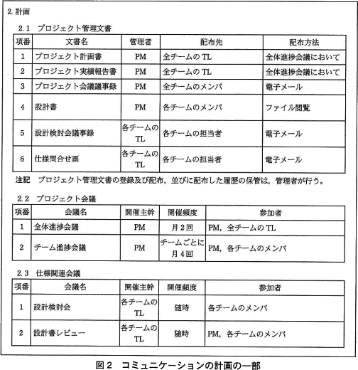 プロジェクト計画書に記載されているコミュニケーションの計画の一部を,図2に示す。