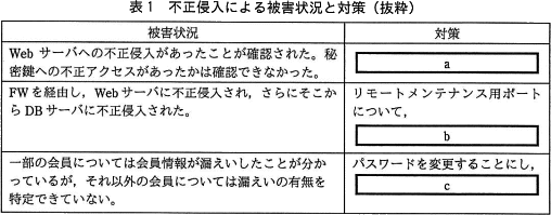 そこで,システム管理者は上司と相談し,会員制サービスを直ちに停止した。次に,今回の不正侵入に対する被害状況の特定と対策の検討を行った。不正侵入による被害状況と対策の一部を抜粋したものを表1に示す。