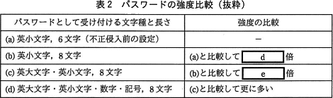 また,パスワードの変更に合わせて,パスワードの強度(パスワートの候補数)の検討を行った。これまでパスワードは,英小文字26文字だけを受け付け,長さは6文字だった。これに対し,他の3通りのパスワードの強度を比較した。その比較結果を表2に示す。