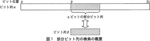 連続する2語から成るビット列αの中から,別のビット列βと一致する部分ビット列を検索する副プログラム BSRH である。部分ビット列の検索の概要を,図1に示す。