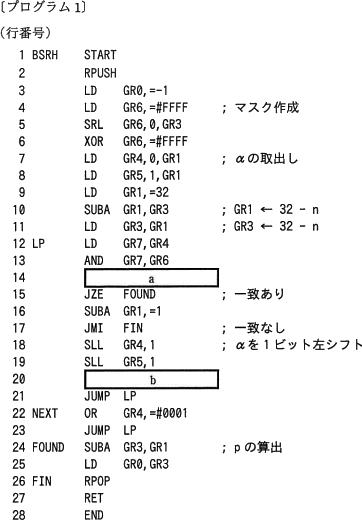 - 主プログラムは,αが格納されている領域の先頭アドレスを GR1 に,βを GR2 に,βの長さn(1≦n≦16)を GR3 に設定して副プログラム BSRH を呼ぶ。βは GR2 に左詰めで設定し,残りのビットには0を設定する。