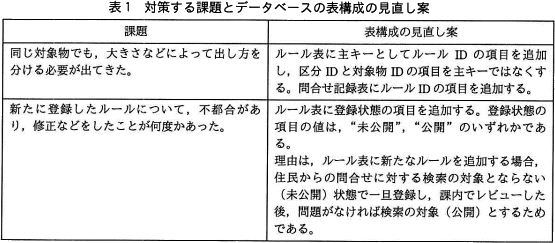 業務を行っている過程で幾つかの課題が明らかになった。これらのうちから対策すべき課題を選び,それを実現するために,データベースの表構成の見直し案を作成した。その結果を,表1に示す。