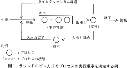 - プロセスの実行の中断などによって,実行中のプロセスがない場合,キューの先頭からプロセスを一つ取り出してCPUに割り当て,実行を開始する。