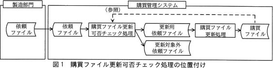 購買ファイル更新可否チェック処理においては,部品の購入依頼情報を格納したファイル(以下,依頼ファイルという)中の各レコードについて,購買ファイルを更新できるかどうかをチェックする。更新することができないレコードは,更新対象外依頼ファイルに出力する。更新することができるレコードは,更新用依頼ファイルに出力し,一連の処理として実行する購買ファイル更新処理に引き渡す。ここで,依頼ファイルは,1日に1回,バッチ処理時間帯に製造部門から受け取る。依頼ファイルには,過去に受け取った購入依頼情報のレコードは含まれない。購買ファイル更新可否チェック処理の位置付けを,図1に示す。