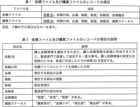 依頼ファイル及び購買ファイルのレコードの項目を表1に,その項目の説明を表2に示す。更新用依頼ファイル及び更新対象外依頼ファイルのレコードの項目は,依頼ファイルのレコードの項目と同じである。