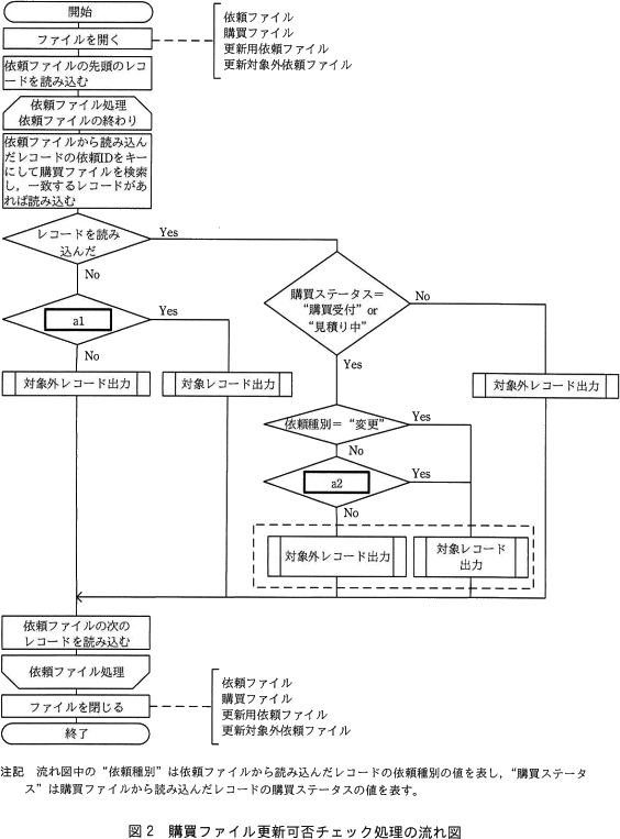 流れ図を見るとa2の分岐は、購買ステータスが"購買受付"・"見積り中"であり、依頼種別が"変更"ではないときに行われる処理です。これは、依頼種別が"削除"であるか否かによって出力先を分ける部分に相当します。Yes のときに更新用依頼ファイルに出力、No のときに更新対象外依頼ファイルに出力することになっているので、適切な分岐条件は「依頼種別="削除"」になります。