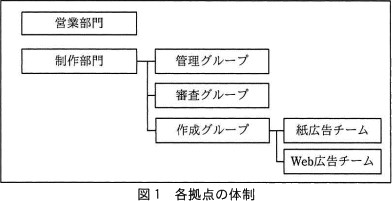 各拠点では,担当するエリア内で営業活動を行い,エリア内の顧客から受け取った広告原稿を基に,広告を制作する。各拠点の体制を,図1に示す。