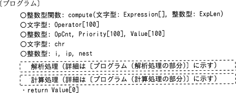 - プログラム中の破線で囲んだ解析処理の部分では,受け取った整数式を解析し,計算に必要な情報を配列及び変数に設定する。