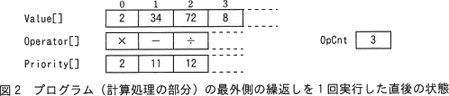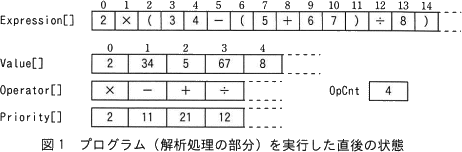 - 例1の整数式について,プログラム(解析処理の部分)を実行した直後の各配列及び変数の状態を,図1に示す。