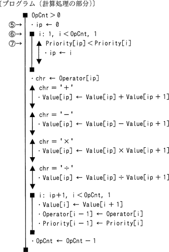 まずは、行③及び④の処理において定数の10を加減する対象となっている変数 nest の役割について考えてみましょう。nest は、行①及び②の処理において、Priority[] に格納される値のベースに使われています。Priority[]は、その名前(priority:優先度)が示すように演算の優先順位を保持する配列で、〔プログラム(計算処理の部分)〕ではこの値が大きい演算から先に順番する処理になっています。