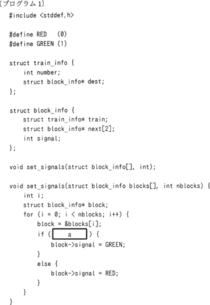 〔プログラム1〕の説明に「区間内にいる列車を表現した,構造体 train_info へのポインタである。区間内に列車がいないとき,NULLを設定する」とあるように、区間内の列車の有無は、構造体 block_info のメンバーである train が保持しています。[a]の1つ上の行で、変数 block に現在の区間情報(block_infoの先頭アドレス)を格納しているので、この block を使って「block->train == NULL」という式を入れれば、真のときに緑に、偽のときに赤にという分岐処理を実現できます。