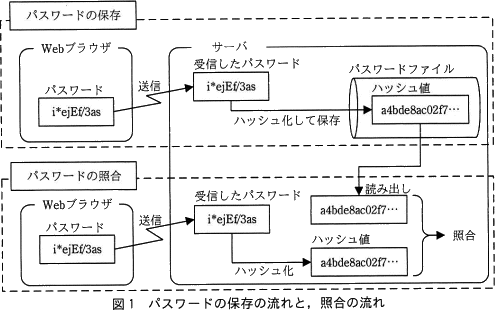 Cさんは対策として,パスワードを平文で保存するのではなく,ハッシュ関数で,パスワードのハッシュ値を計算(以下,ハッシュ化という)し,そのハッシュ値を保存する方式を提案することにした。この方式におけるログイン時の認証では,受信したパスワードから求めたハッシュ値を,パスワードファイルに保存されているハッシュ値と照合する。パスワードの保存の流れと,照合の流れを図1に示す。