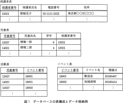 データベースの表構成とデータ格納例を図1に示す。下線付きの項目は,主キーを表す。