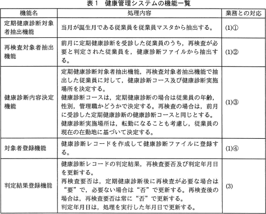 健康管理システムの機能一覧を,表1に示す。表1において,"業務との対応"列の項番は,〔健康管理システムを利用した健康診断管理業務の説明〕の項番に対応する。各機能では,健康管理システムの健康診断ファイルのアクセスと,人事システムの各マスタファイル(以下,マスタという)の情報の参照を行う。