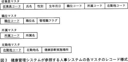 健康管理システムが参照する人事システムの各マスタのレコード様式を,図3に示す。下線付きの項目は,主キーである。