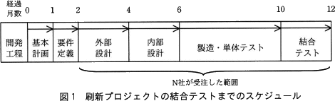 - S社から提示された刷新プロジェクトの結合テストまでのスケジュールは,図1のとおりである。