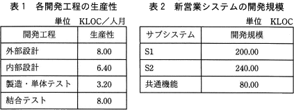 - N社では,新営業システムと類似するWebシステムの開発をこれまで複数案件行っており,組織のプロセス資産として各開発工程の生産性のデータを保有している。N社が保有する各開発工程の生産性を,表1に示す。Y君は,要件定義の成果物である要件定義書とN社の過去の開発実績を参考にして,表2に示すとおりに新営業システムの開発規模を見積もった。ここで,KLOC(Kilo Lines Of Code)は,ソースコード1,000行を単位とする指標である。