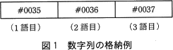 - 管理テーブルには,文字列中に数字列が現れるごとに,順に1語から成る要素を追加し,数字列を数値に変換して得た値を格納する。数字列の探索が終了したとき,管理テーブルの最後に1語から成る要素を追加し,数値の終わりを示す印として-1を格納する。図2の文字列を GETWD で処理して得た管理テーブルを,図3に示す。
