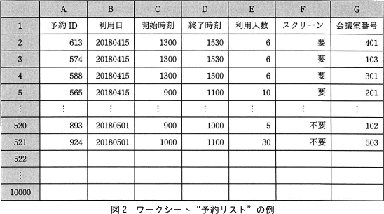 予約の一覧は,ワークシート"予約リスト"に格納されている。ワークシート"予約リスト"の例を,図2に示す。