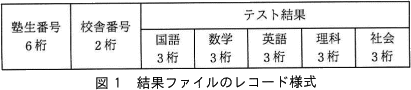 - 結果ファイルは,図1に示すレコード様式の順ファイルであり,1学年分のレコードが格納されている。