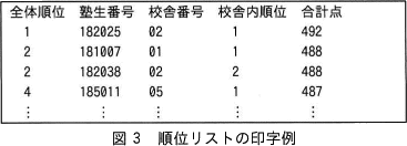 - 全体順位には塾全体での順位を,校舎内順位には塾生が所属する校舎での順位を印字する。印字行は合計点の降順に並べる。