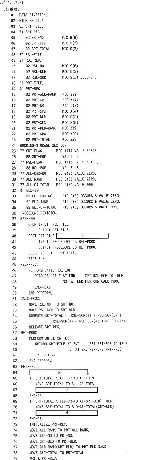 次のCOBOLプログラムの説明及びプログラムを読んで,設問1,2に答えよ。